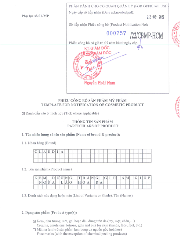 - Tên sản phẩm: Bộ dưỡng da, Ngừa Lão Hóa Claudia