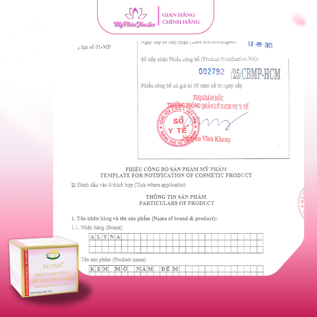 - Nhãn hàng: Alyna – Phân phối bởi Mỹ phẩm Hoa Sen
